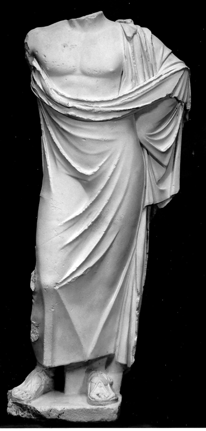 Eine Kopie einer dieser späteren, vom Asklepios Giustini abgeleiteten Statuen ist in Abguß Inv. 398 zu sehen. Allerdings sind bei diesem Stück der gesamte Unterkörper ab Kniehöhe und der rechte Arm mit dem Schlangenstab ergänzt. Der Kopf ist zwar antik, aber modern aufgesetzt und gehört nicht zu diesem Typus. Übrig bleibt ein Torso, dem man deutlich ansieht, daß der Körper im Vergleich zu dem des Asklepios Giustini stärker geschwungen war; der Mantelbausch hängt schwerer herab und ist voluminöser. Wie vollständigere Kopien des gleichen Statuentypus zeigen, wurden die Gewandmotive gegenüber denen des Asklepios Giustini stark verändert. Auf das V-Motiv vor den Unterschenkeln wurde verzichtet, stattdessen zog sich von der Standbeinhüfte zum Spielbeinfuß ein Bündel locker durchhängender Falten. Diese Art der Gewandgestaltung betonte also stark den Kontrast zwischen tragendem Standbein und entlastetem Spielbein. Das Original wird um die Mitte des 4. Jh. entstanden sein. Der zugehörige Kopftypus ist nicht bekannt. Auch diese Statue wurde als Vorbild für Asklepiosfiguren attischer Reliefs verwendet.