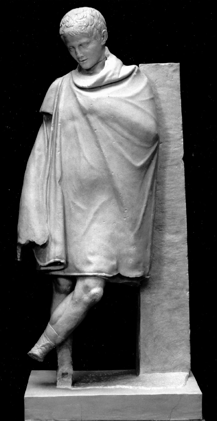 Die Größe des Knaben von 1,47 m entspricht ungefähr seiner Altersstufe. In halb lässiger, halb angespannter Haltung lehnt er an einem Pfeiler. Bekleidet ist er mit einem kurzen Chiton mit kurzen Ärmeln und einem ebenso kurzen Mantel, der ganz um den Körper geführt und nur auf der rechten Schulter zusammengehalten ist. Er trägt Strümpfe und Sandalen, deren gitterartige kunstvolle Verschnürung fast bis an die Waden heranreicht. Das Gewicht des Knaben ruht auf dem rechten Bein, das linke ist etwas nach vorn geführt und quer über das rechte geschlagen. Vom linken Fuß können nur die kleinen Zehen leicht den Boden berührt haben und mögen so den Eindruck eines leicht unruhigen Standes hervorgerufen haben. Die Haltung der Arme zeichnet sich unter dem dicken Stoff des Gewandes ab. Der rechte greift in den hinteren Saum des Mantels und zieht ihn fast schwungvoll nach vorn, der linke ist im Ellbogen eingeknickt, der Unterarm liegt quer vor der Brust. Die strafferen Zugfalten, die von der Hand ausgehen, deuten darauf hin, daß auch hier eine Bewegung gemeint ist, die das Gewand zurechtrückt und ordnet. Von einem Ruhegestus kann demnach nur bei flüchtigem Hinsehen die Rede sein. Der Kopf des Knaben ist relativ stark zur Standbeinseite hin geneigt. Sein Umriß ist eigenwillig, vor allem das Untergesicht eher kantig als schönlinig. Die Haare fallen in sichelförmigen kurzen Locken, womit sie an Frisuren des 5. Jh.v.Chr. erinnern. Die Ohren sind deutlich geschwollen.