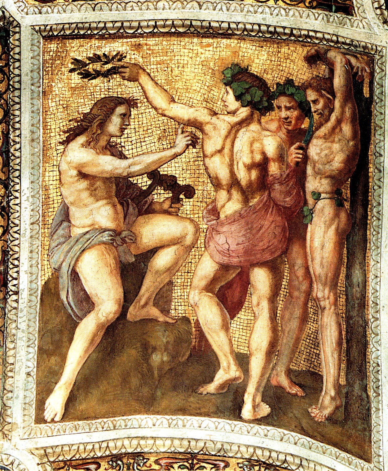 Nicht die erste, aber eine der berühmtesten Rezeptionen der Statue des Marsyas finden wir an der Decke der Stanza della Segnatura im Vatikan (um 1510). Anders als in den späteren Interpretationen ist hier, wie in der Antike nicht die Schindung selbst, sondern ein Moment davor – die Krönung Apolls zum Sieger dargestellt. Rechts ist der, dem antiken Vorbild nachempfundene Marsyas zu erkennen. Neben ihm wartet der stehende Schleifer in angstvoller Pose auf den Befehl des Gottes mit der Bestrafung zu beginnen. Der goldene, aufgemalte Mosaikhintergrund verleiht dem Bild eine gewisse überzeitliche Komponente (Abb.). Die Interpretation des gesamten Bildprogramms der Stanza della Segnatura, die Papst Julius II. wahrscheinlich als Bibliothek und Studierzimmer diente, wird bis heute in der Kunstgeschichte ohne allgemein überzeugendes Ergebnis diskutiert. Für das Marsyasthema lässt sich wohl nur feststellen, daß hier in der Gestalt Apolls die göttliche Inspiration des Dichters und Musikers gefeiert wird und der antike Mythos als Parallele zum Sündenfall gesehen wird, der in der anderen Kassette an dieser Seite der Decke dargestellt ist.