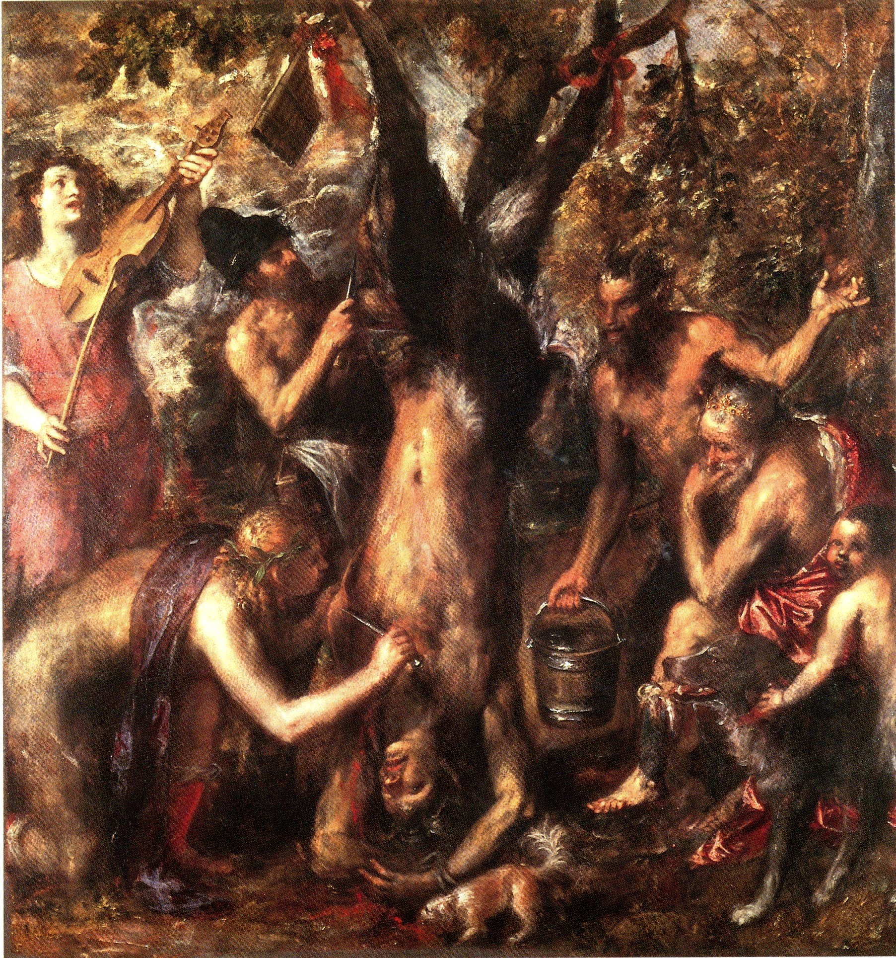 Einen völlig anderen Weg der Darstellung schlug der Venezianer Tizian ein, dessen Schindung des Marsyas zwischen 1571 und 1576 entstand und im expressiven Stil der Jahre kurz vor seinem Tod gemalt wurde. Nach dem antiken Vorbild ist Marsyas zwar an einen Baum gebunden, er hängt jedoch wie ein zu häutendes Tier mit dem Kopf nach unten. Apoll tritt nicht als strahlender Sieger auf, sondern beteiligt sich mit beinahe kindlichem Eifer an der Schindung. Der Maler wählte den Tod des Marsyas als den Moment der größten Grausamkeit und des Schreckens, der sich in den Gesichtern der Beobachter unterschiedlich widerspiegelt. Der kleine Satyr am rechten Bildrand blickt den Betrachter direkt an, der damit aufgefordert wird, sich sein eigenes Urteil über das Geschehen zu bilden. Dies erinnert an Bilder des Leidens der christlichen Märtyrer, die ebenfalls zum Mitleiden und zum Nachdenken über die eigenen Fehler auffordern. Gleichzeitig zeigt Tizian so deutlich wie kein anderer vor ihm, um welchen Preis der göttliche Wille in die Tat umgesetzt wird.