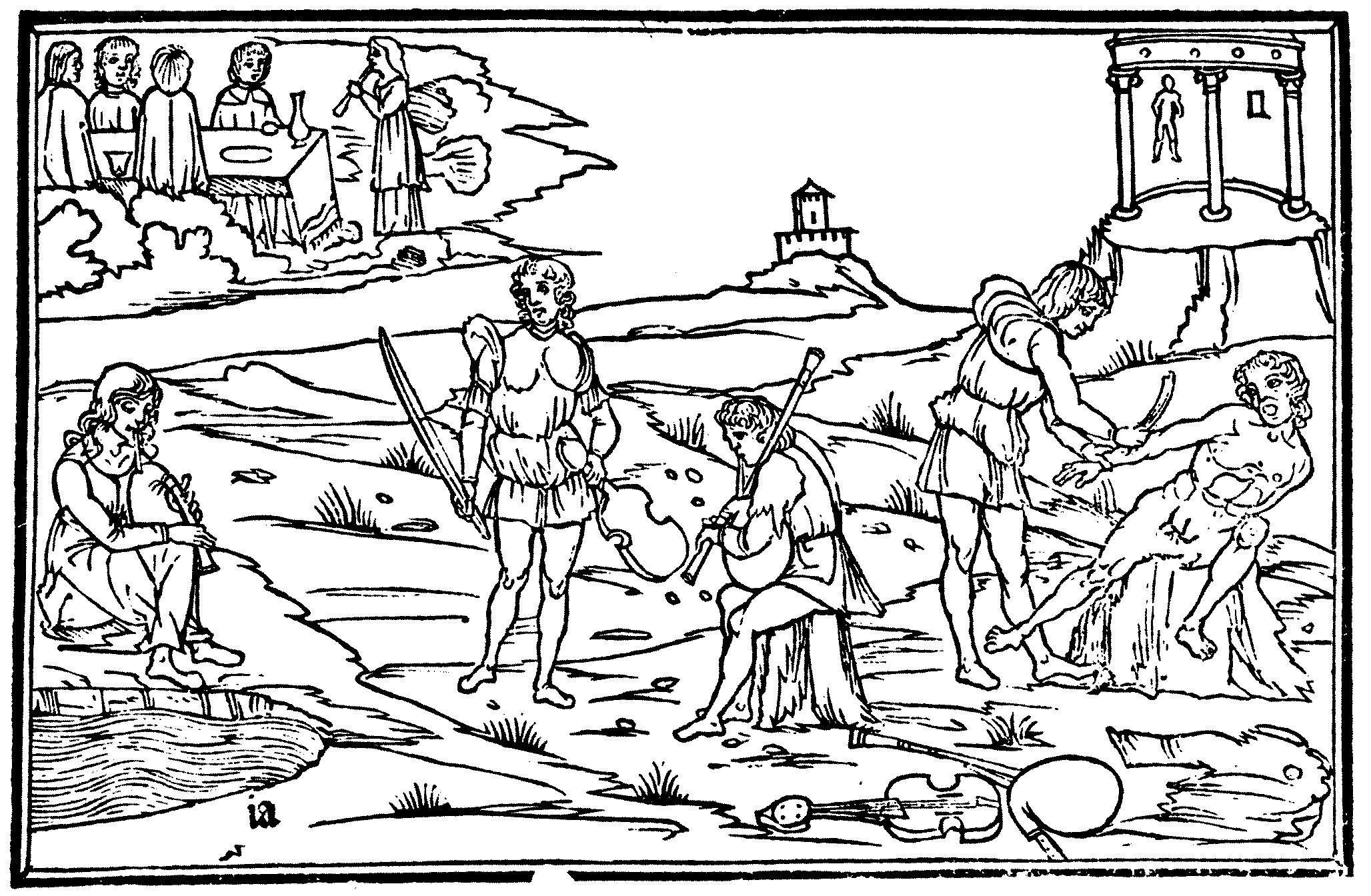 Apoll und Marsyas, Holzschnitt aus: Ovidio metamorphoseos vulgare, Venedig 1497