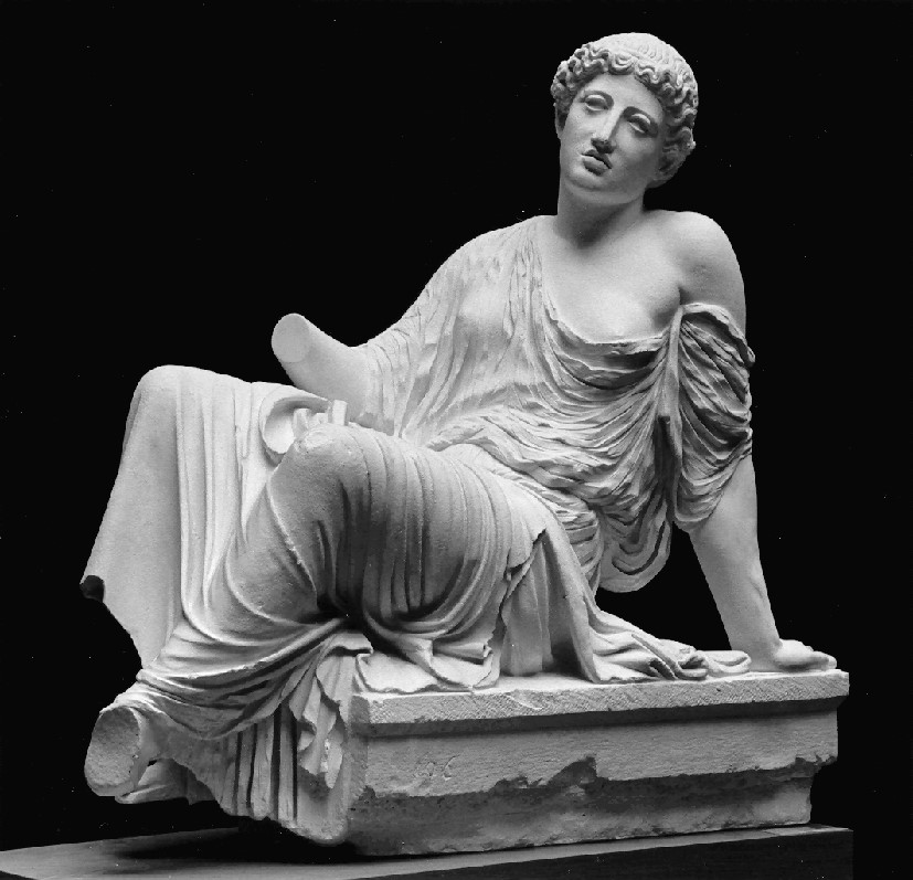 Die Sitzhaltung der Statue ist also keineswegs stabil. Dieses Bewegungsmotiv könnte man als ein jähes Zurückweichen erklären, wobei der Körper mit einem Arm abgefangen wird und die Beine durch den Schwung emporgehoben werden. Ebenso wäre vorstellbar, daß die Frau unbequem auf einer Treppenstufe sitzt, so daß die Beine aufgrund der geringen Stufenhöhe nicht auf der Sitzfläche aufliegen.