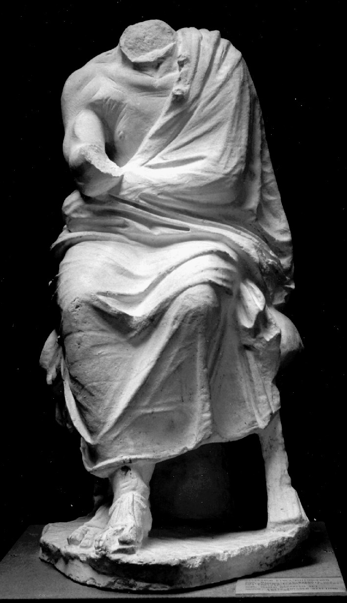 Die Statuette ist eine von insgesamt fünf, nahezu gleichgroßen Repliken, die unter Archäologen stets die Vermutung auslösten, bei dem Dargestellten müsse es sich um eine bekannte Persönlichkeit handeln. Das verlorene Original wird wohl lebensgroß gewesen sein. Deren Identifizierung mit einem berühmten Philosophen wurde denn auch immer wieder versucht. Wesentliche Anhaltspunkte ihrer Benennung lieferte dabei die mit Kopf fast vollständig erhaltene Bronzereplik in London, in der man die Stoiker Zenon oder Kleanthes erkennen wollte. Der längere und auffälligere Mantel jedoch erinnerte K. Fittschen jüngst an die Statuen der Epikureer.
