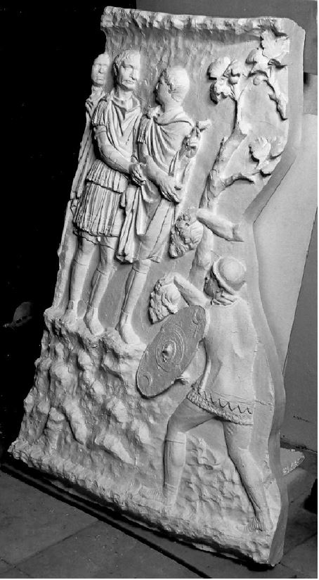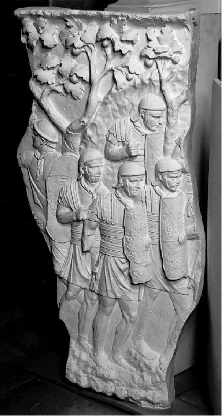 Hier findet die Übergabe abgeschlagener Dakerköpfe an den Kaiser statt. Im Anschluß daran, rechts, Legionäre, die bereit sind in die Schlacht einzutreten (Die Schlacht würde sich rechts an die Platte anschließen, ist aber nicht mehr auf Abguß vorhanden).